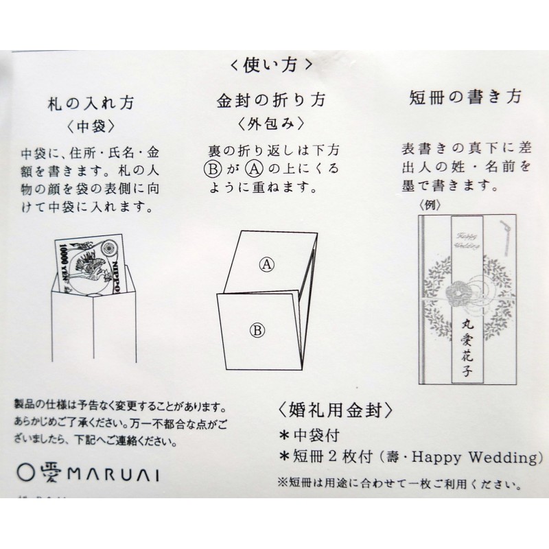 Koperta zawiera dwa rodzaje wąskich kart, które dołącza się odpowiednio do okazji: 壽''najlepsze życzenia'' i Happy Wedding "szczęśliwego ślubu"
