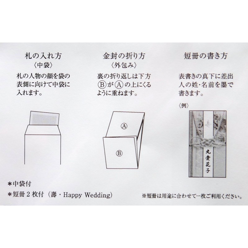 Koperta zawiera dwa rodzaje wąskich kart, które dołącza się odpowiednio do okazji: 壽''najlepsze życzenia'' i Happy Wedding "szczęśliwego ślubu"